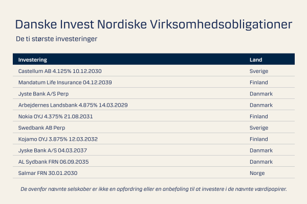 Team: Teamet, ledet af Head of Nordic Fixed Income i Danske Bank Asset Management Cecilie Hoffmeyer, tæller også Thomas Damgaard Nordlunde, Jakob Bendiksen, Teemu Liikanen.*Fondsnavn: Investeringsforeningen Danske Invest Nordiske Virksomhedsobligationer - Akkumulerende, klasse DKK h